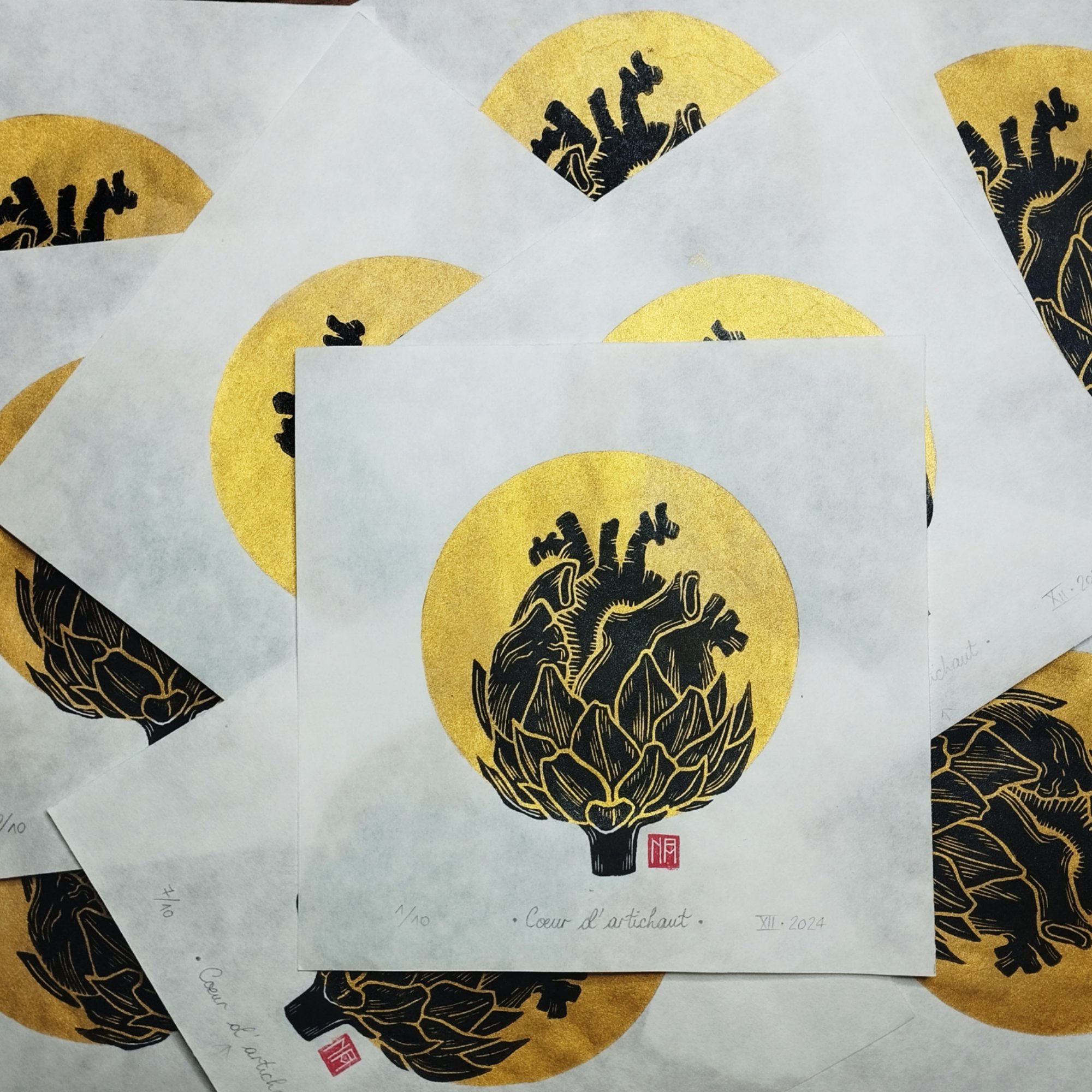 Linogravures 2 couleurs, noir et doré, entièrement réalisées à la main.